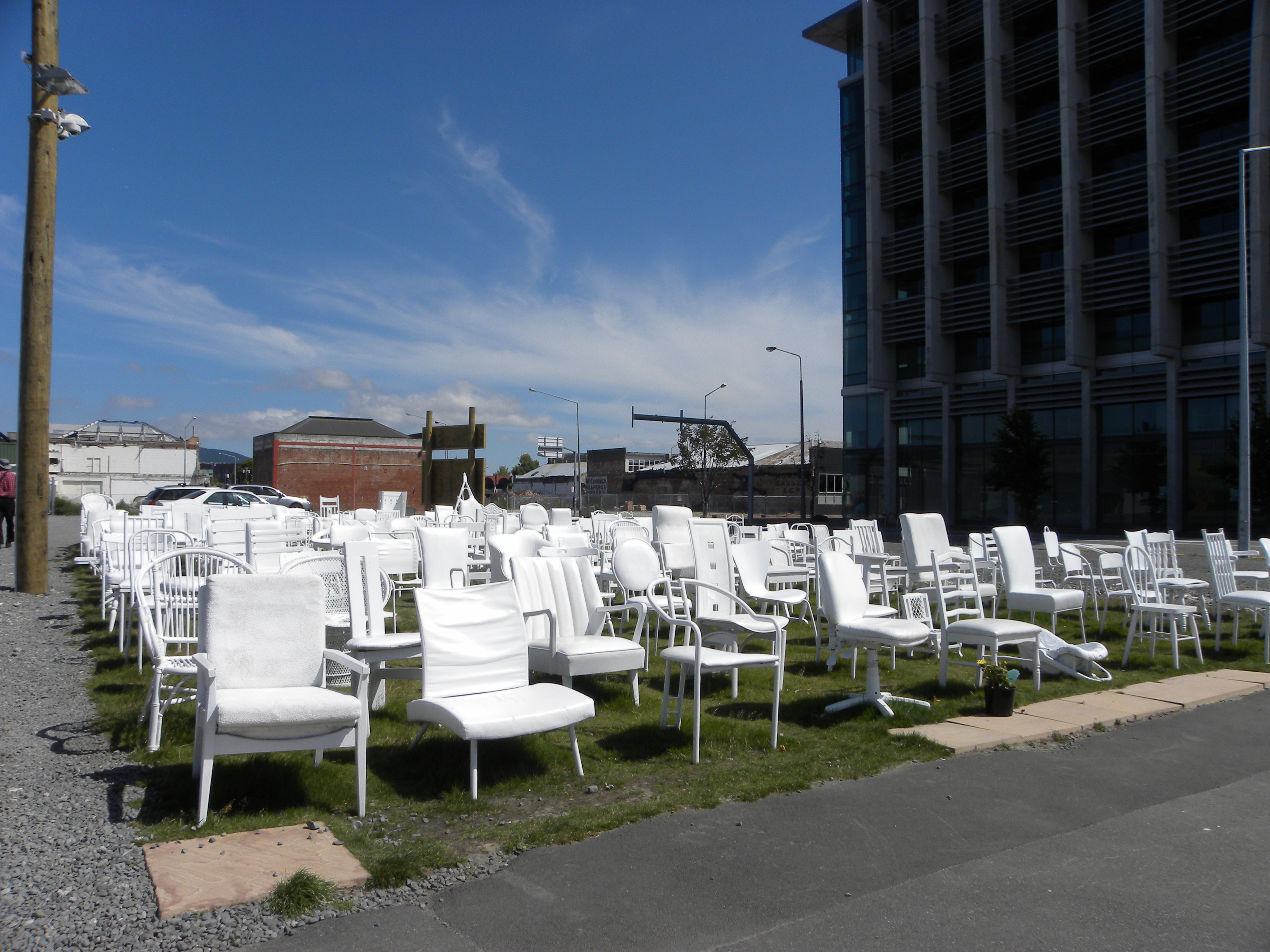 Today I go to Latimer Square. Not much at the square, just and open field of grass, but on my way I pass what use to be the CTV building and an art installation. The CTV building collapsed during the earthquake killing 115 people. There will be a memorial on this site remembering the people that died. There is a temporary art installation of 185 empty chairs reflecting on the lost lives from the earthquake.