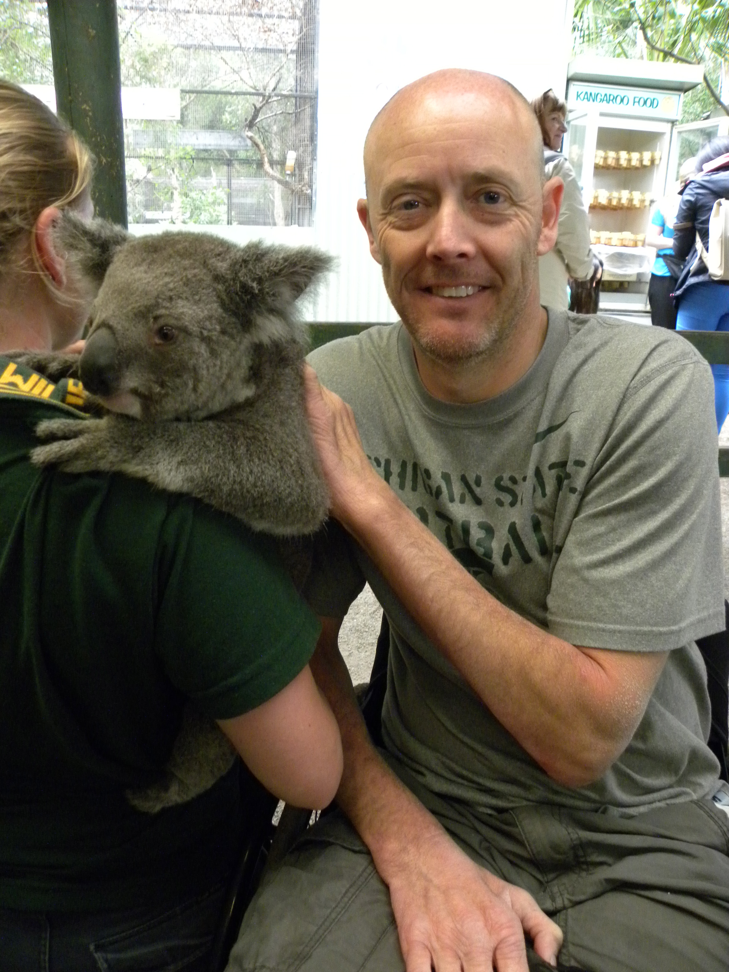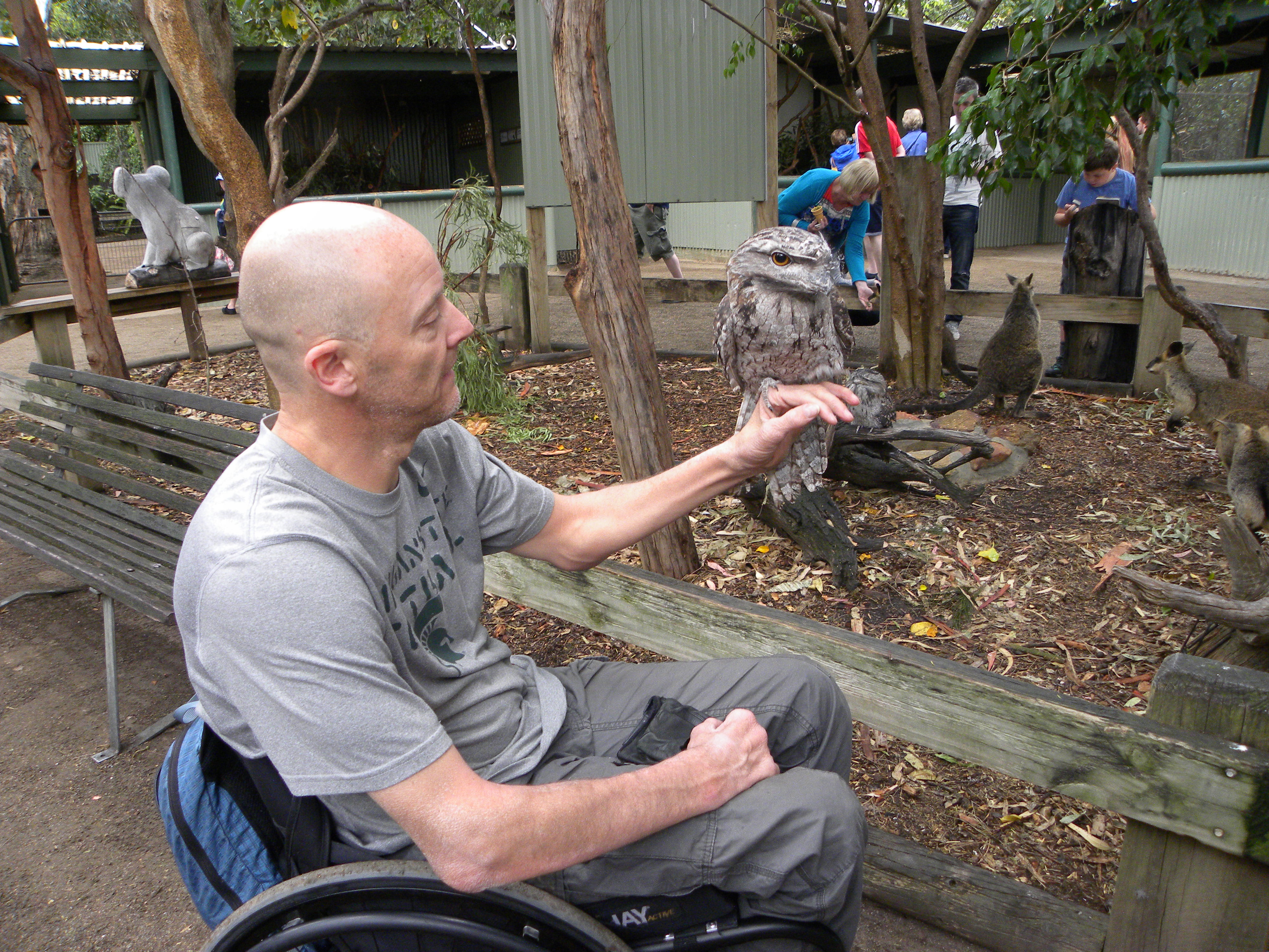 The Blue Mountains Tour with Blue Diamond Tours includes the Featherdale Wildlife Park, Aboriginal Center and Blue Mountains. Ian is our driver/guide for the tour today. The weather is cloudy with light rain and only 68 degrees. Blue Diamond Tours give you option of not taking the tour and going at a later date but I have other things planned for the rest of my stay. Blue Diamond Tours is the only tour company that gives you this option. The Mercedes Benz mini bus has 3 small steps to get up but I was able to transfer directly to the top step then transfer to the seat. After the wheels were removed, the chair stored easily in the back of the bus. After a 45 minute ride we arrived at Featherdale Wildlife Park. The park is hard packed sand and a little messy with the light rain. There are accessible bathrooms at different locations in the park. You have a great opportunity to interact with some of the animals. I did get to pet a koala, kangaroo, wallaby and hold an owl. We were only at the park for 1 hour but I could have stayed another 3 hours. A down fall of taking group tours.